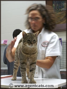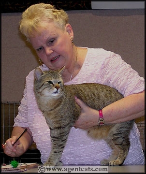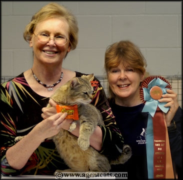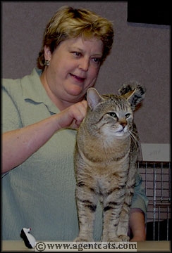 Recon has been very successful in the show ring, achieving the highest title possible, Supreme Grand Champion, extremely quickly. Vickie Fisher (TICA president pictured above) was the judge who made him Best Cat for his Supreme at the early age of 9 months old. He is also a double regional winner. Oh, the Reeses Cup . . . that was Recon's thank you gift to Vickie, her favorite candy.