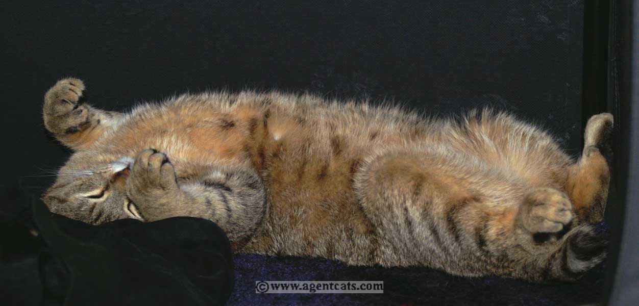 At one show, I was at the benching area, Recon was laying on his back (like the picture below) making biscuits in the air while I rubbed his tummy. A lady came and introduced herself as a sister of another Pixie Bob breeder. We had a very nice conversation and then she asked if I ever had temperament problems with my boys . . . I looked at Recon, on his back, purring with his front paws marching in the air . . . oh yeah, our boys have a temperament problem, a happy, lovable temperament problem. What a wonderful problem to have.